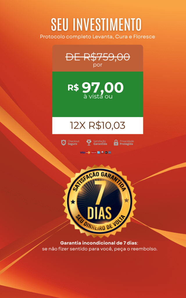 É um processo de 21 dias, dividido em 3 partes(levantar, curar e florescer) ATRAVÉS de aulas gravadas guiadas, exercícios práticos e frases-âncora diárias para ajudar você a curar feridas emocionais, resgatar sua força interior e florescer em uma nova fase da vida
